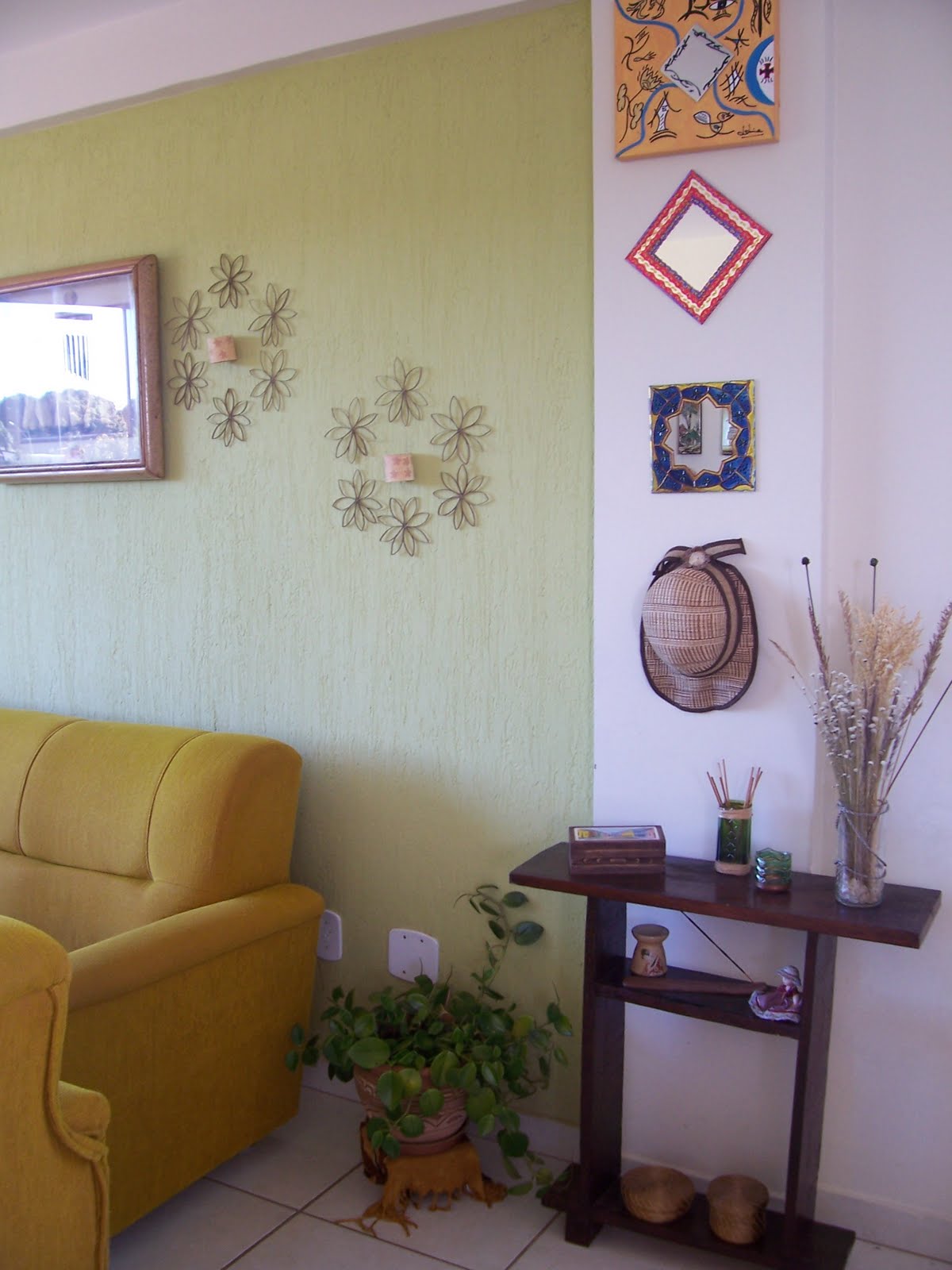 Em cada canto da minha casa, tem peças de materiais recicláveis. Peças que gosto muito, muitas minhas e de outros artistas também. Vou começar de como ela esta hoje e pela parede da entrada da sala. Este quadro é da artista Aurea Donato de Palmas Tocantins, todo em palhas variadas. Os painéis de flores são de minha autoria. As flores são de rolinhos de papel higiénico, e as latinhas de molho de tomate.
